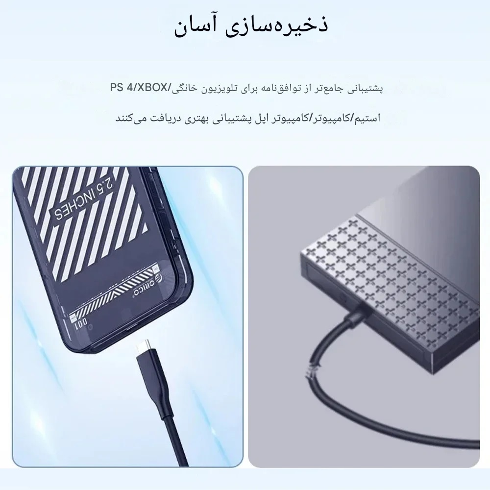 محصول ORICO 2599C3-CR-EP یک باکس تبدیل هارد/اساسدی ۲٫۵ اینچی SATA به رابط USB Type-C است که برای استفادههای قابل حمل، آرشیو دادهها، بکآپگیری سریع و ارتقای آسان لپتاپها یا کامپیوترها طراحی شده است.