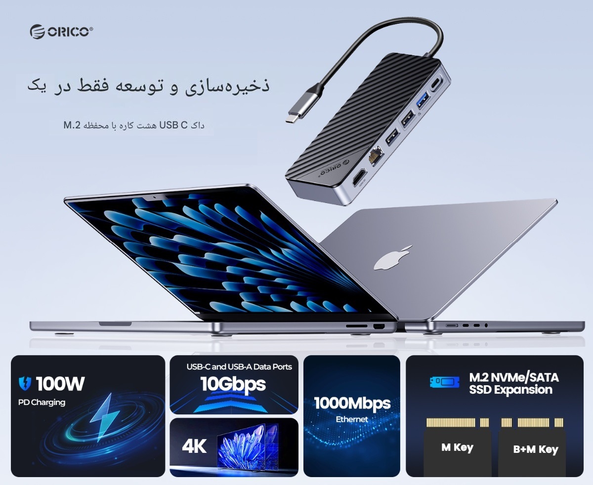 ORICO-OM28PR-G2 یک داکینگاستیشن همهکاره 8 در 1 از برند معتبر اوریکو (ORICO) است که بهعنوان یک ایستگاه توسعهدهنده امکانات لپتاپ و کامپیوتر طراحی شده است. این محصول با ترکیب پورتهای متعدد، پشتیبانی از حافظههای M.2 و قابلیتهای ارتباطی پیشرفته، امکانات ورودی/خروجی دستگاههای شما را بهطور چشمگیری افزایش میدهد.