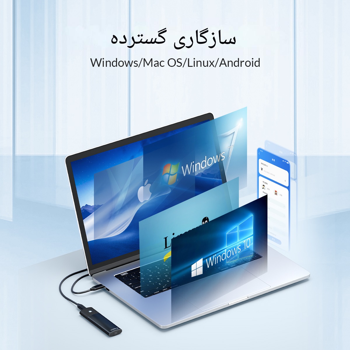 رابط خروجی دستگاه میزبان: برای دستیابی به حداکثر سرعت، دستگاه میزبان (لپتاپ، دسکتاپ) باید پورت USB-C یا USB 3.2 Gen2 داشته باشد؛ در غیر این صورت سرعت به پورت ضعیفتر محدود میشود.